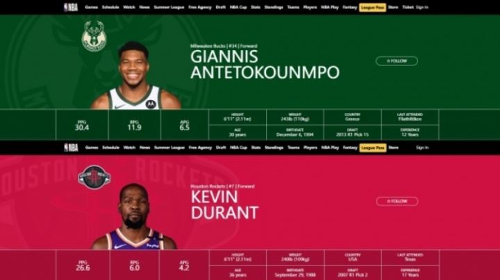 官网数据显示:杜兰特的身高和字母哥一样 体重仅比后者轻不到3斤