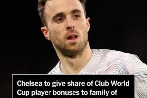 TA:切尔西将球员的部分世俱杯奖金捐给若塔家人,数额超50万美元