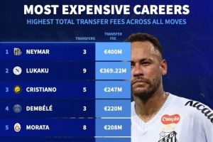 体育资讯7月22日讯 德国转会市场统计了球员生涯总转会费,并列出榜单,内马尔居首,卢卡库、C罗排名二三位。